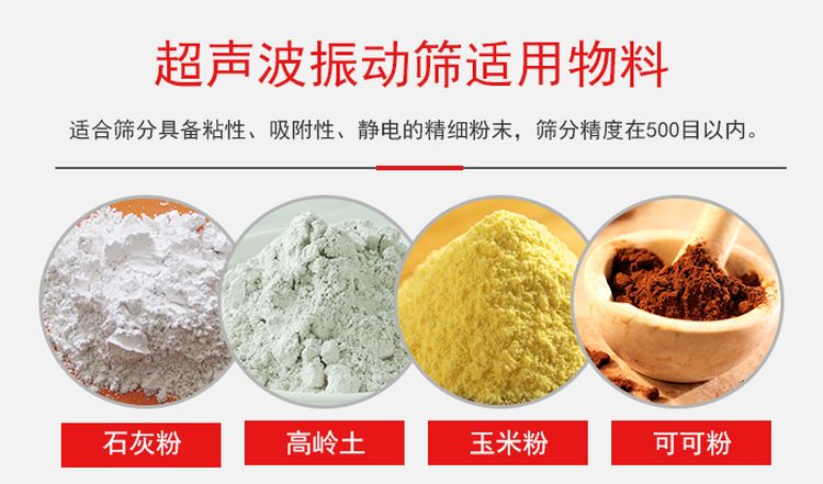 由于超聲波振動(dòng)篩加裝了超聲波篩分系統(tǒng),適合篩分具備粘性、吸附性、靜電的精細(xì)粉末,篩分精度在500目以內(nèi),所以在篩分比較細(xì)的物料超聲波振動(dòng)篩的還是站具很大得優(yōu)勢(shì)。