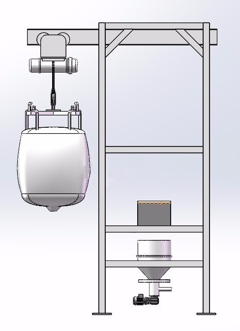噸包投料站又稱噸袋拆包機(jī),是用來實(shí)現(xiàn)袋裝散裝物料的卸料功能,為半自動操作。包裝袋由電動葫蘆提升,包裝袋的袋繩掛在鋼性支架上,手動操作控制葫蘆升降和行走,沿著行走導(dǎo)軌運(yùn)行到卸料區(qū)上方落下,將包裝袋放置在支架托盤上,使大袋處于卸料位置。然后手動打開卸料閥操作門,人工將包裝袋的卸料口拉入到卸料閥的系口出,按下系帶按鈕,卸料閥束緊氣缸將袋口鎖緊,再手動將大袋的卸料口從卸料位置拉下,罩在卸料口密封箱內(nèi)的出料管外側(cè),按下壓袋機(jī)構(gòu)氣動控制開關(guān),使密封法蘭下降,并緊壓在出料管的管端,密封卸料通道,以防卸料過程中粉塵漏,接著,人工解袋,關(guān)上操作門。手動開啟與卸料口密封箱連接的通風(fēng)除塵管道上的閥門。至此,卸料準(zhǔn)備過程結(jié)束。
