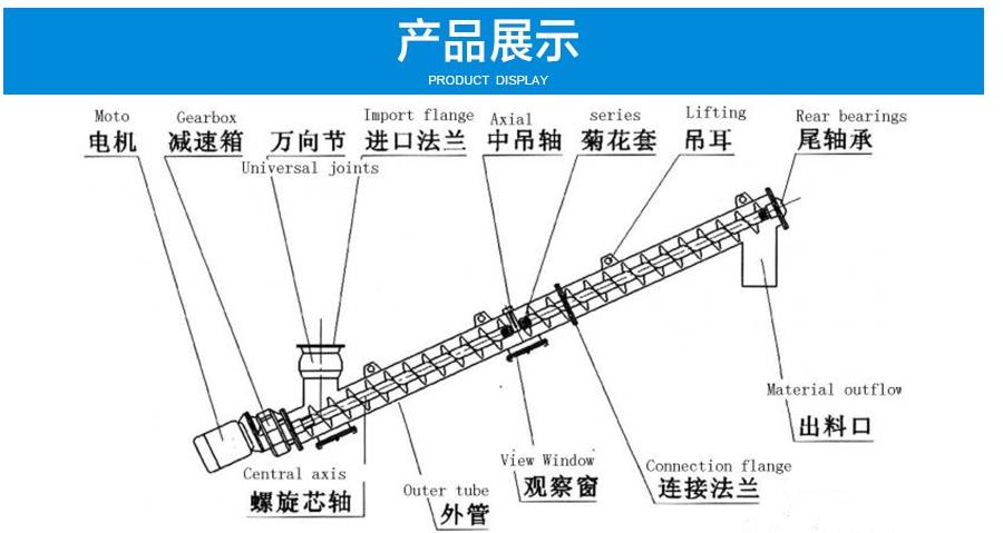 LS型螺旋輸送機(jī)是利用旋轉(zhuǎn)的螺旋將被輸送的物料沿固定的機(jī)殼內(nèi)推移而進(jìn)行輸送工作,頭部及尾部軸承移至殼體外,吊軸承采用滑動(dòng)軸承設(shè)有防塵密封裝置,軸瓦一般采用粉末冶金,輸送水泥采用毛氈軸瓦,吊軸和螺旋軸采用滑塊連接。