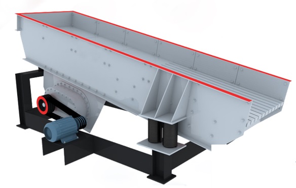 ZSW系列振動給料機主要由彈簧支架、給料槽、振動器、彈簧及電機等組成.激振器是由兩個成特定位置的偏心軸有齒輪嚙合組成,裝配時必須使兩齒輪按標記相嚙合,通過電機驅動,使兩偏心軸旋轉,從而產生巨大的合成直線激振力,使機體在支承彈簧上作強制振動,物料則以此振動為主動力,在料槽上作滑動及拋擲運動,從而使物料前移達到給料的目的.當物料通過槽體上的篩條時,較小的料通過篩條間隙落下,可不經過下道破碎工序,起到了篩分的效果.
