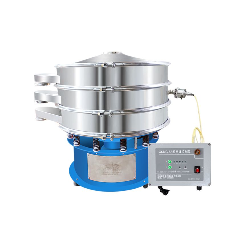 超聲波振動篩是在旋振篩的基礎(chǔ)上引入了超聲波清網(wǎng)裝置,通過將220V、50Hz或110V、60Hz電能轉(zhuǎn)化為18KHz的高頻電能,輸入超聲換能器,將其變成18KHz機械振動,從而達到高篩分和迅速清網(wǎng)的目的,使超微細粉篩分成為易事。該系統(tǒng)在傳統(tǒng)的振動篩基礎(chǔ)上在篩網(wǎng)上引入一個低振幅、高頻率的超聲振動波(機械波),以改善超微細粉體的篩分性能。特別適合高附加值精細粉體的用戶使用。超聲波篩分系統(tǒng)是一種簡單實用、可靠的篩分系統(tǒng),是當(dāng)前網(wǎng)孔堵塞的有效的解決方法??蓮V泛應(yīng)用于制藥、冶金、化工、選礦、食品等要求精細篩分過濾的行業(yè),篩分過濾精度高,有效解決因團聚、靜電、強吸附性卡堵網(wǎng)孔等篩分難題,是國內(nèi)篩分行業(yè)的一項重大技術(shù)突破。