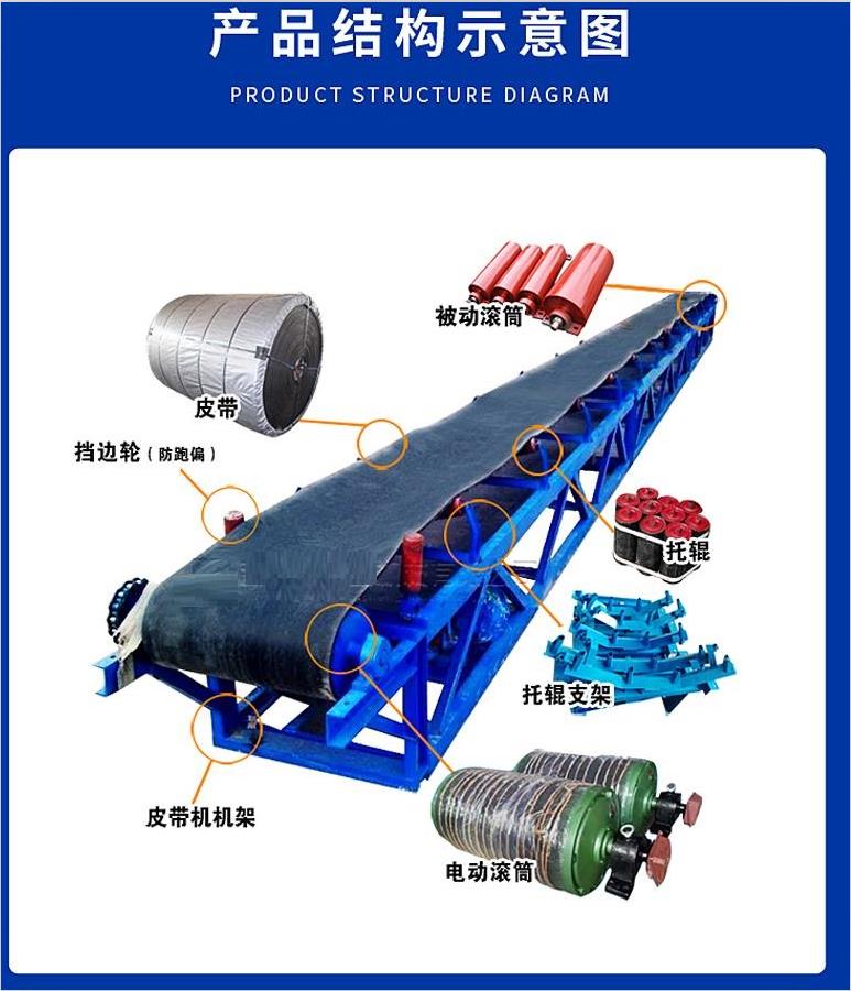 帶式輸送機結構形式有: 水平直線輸送、提升爬坡輸送、轉彎輸送等多種形式,輸送帶上還可增設提升擋板、側擋板等附件,能滿足各種工藝要求。