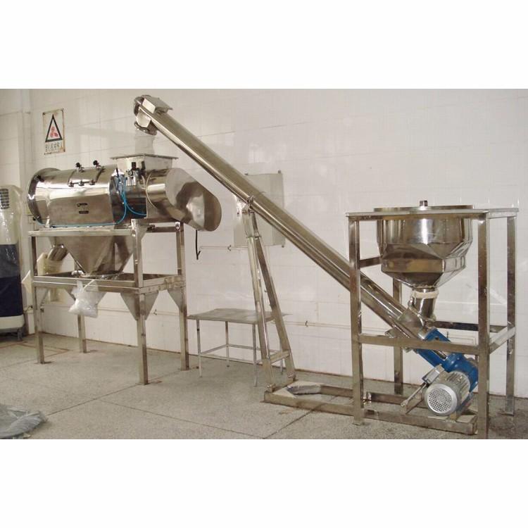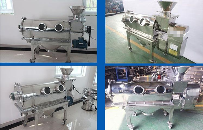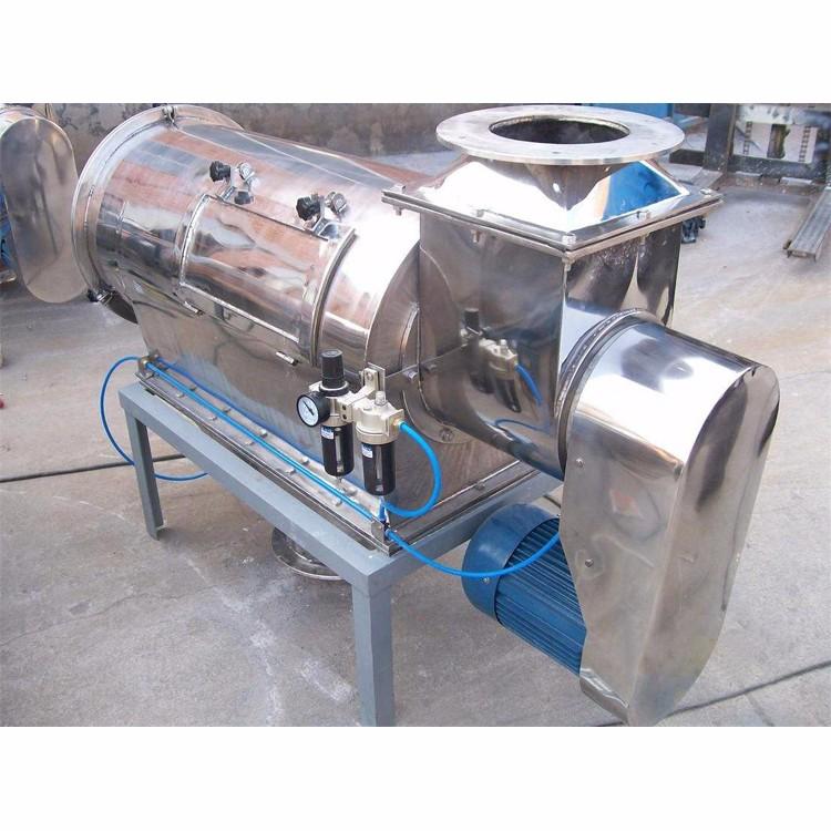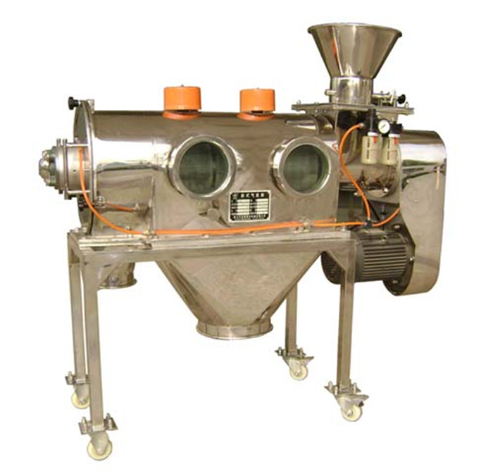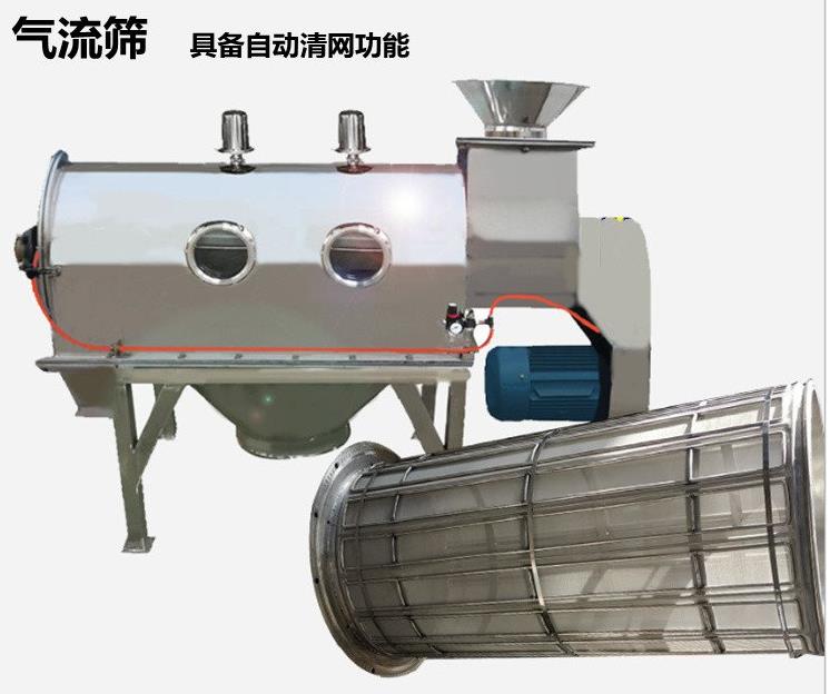 臥式氣流篩篩網(wǎng)為圓筒狀,置于機體內,物料通過螺旋輸送系統(tǒng)后,和氣流混合、霧化進入網(wǎng)筒內;