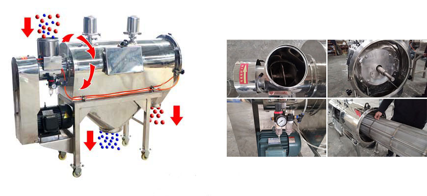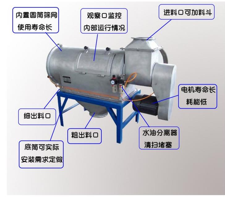不能過網(wǎng)的物料沿筒壁從粗料排出口排出,達到快速分離的目的。