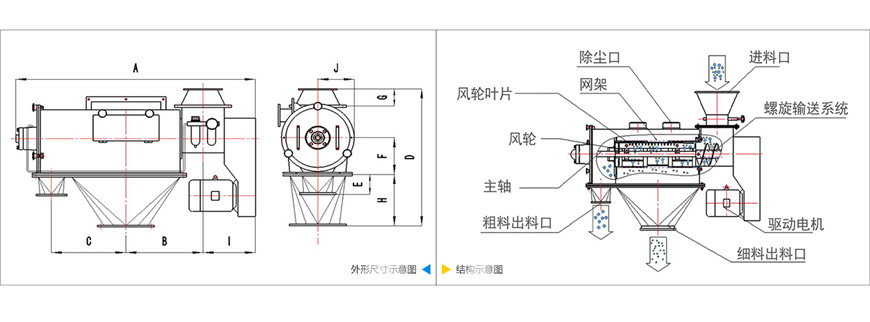 通過網(wǎng)筒內風輪葉片使物料同時受離心力和旋風推進力,從而迫使物料噴射過網(wǎng),由細料排出口排出,不能過網(wǎng)的物料沿網(wǎng)筒壁從粗料排出口排出。