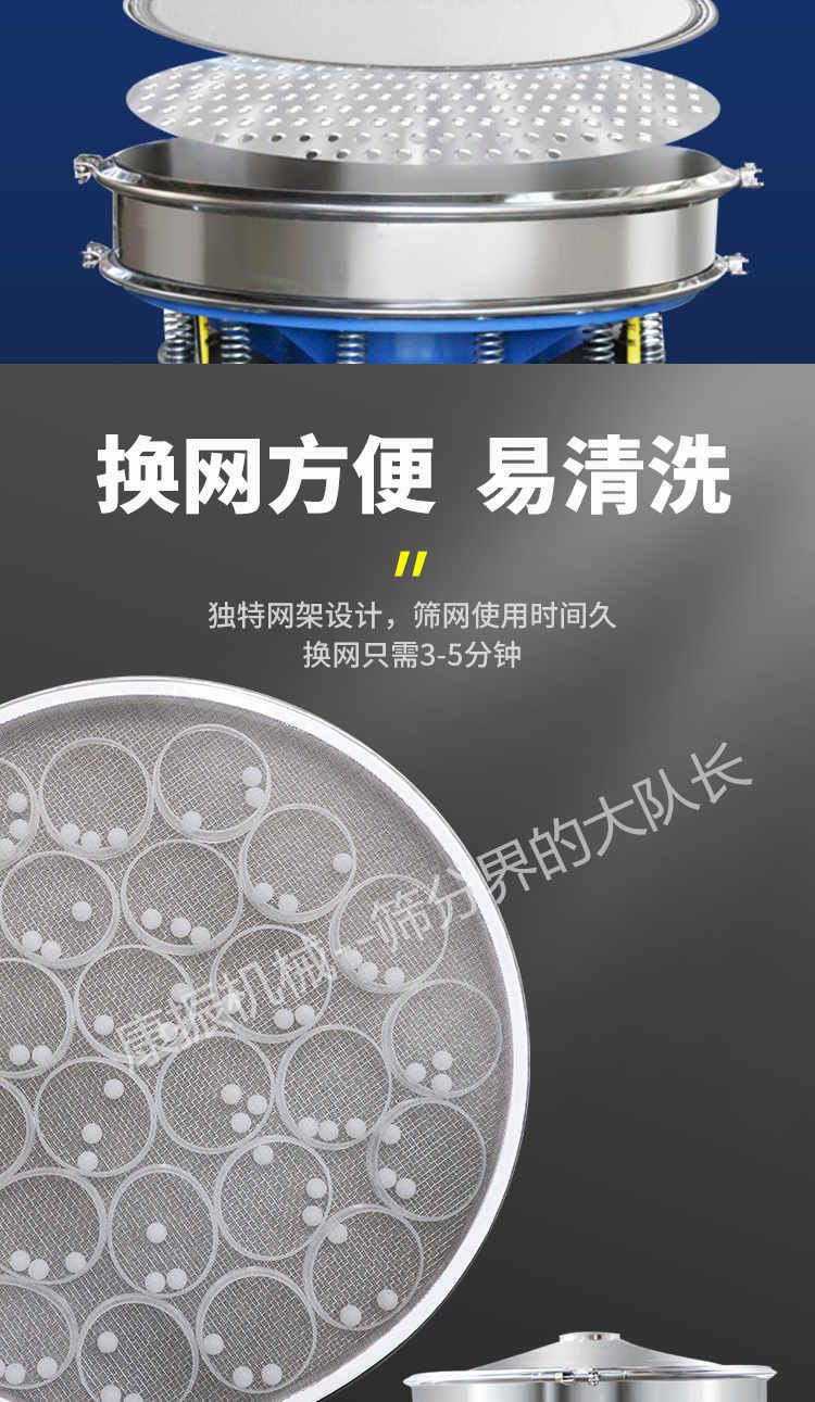 篩網(wǎng)更換便捷—旋振篩根據(jù)不同需要有多種網(wǎng)架結構;其中一種把更換篩網(wǎng)的時間降到3~5分鐘,比其他類型篩機節(jié)約30~60分鐘。篩網(wǎng)壽命更長,效率更高。