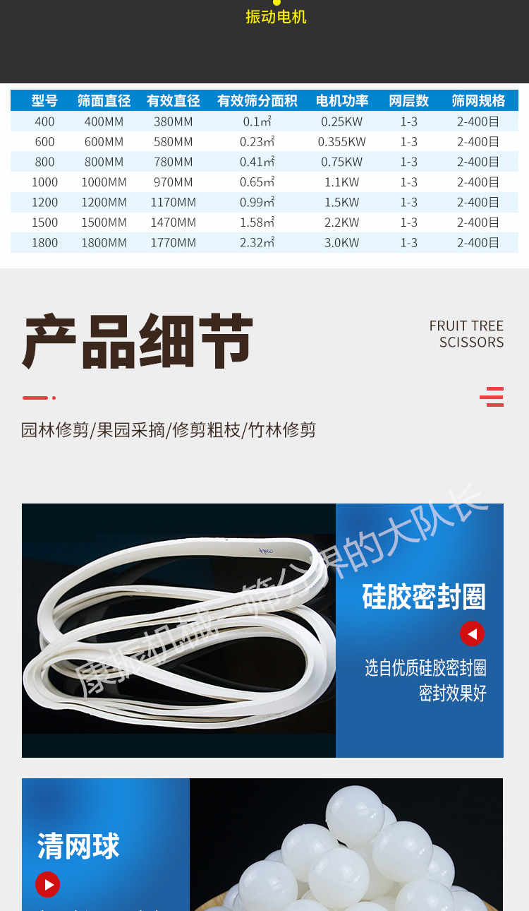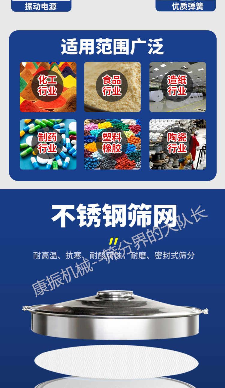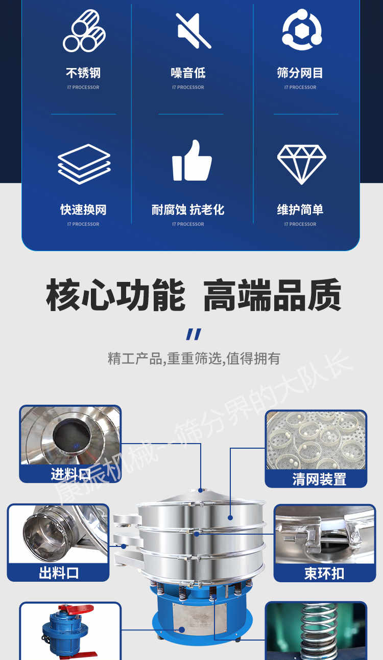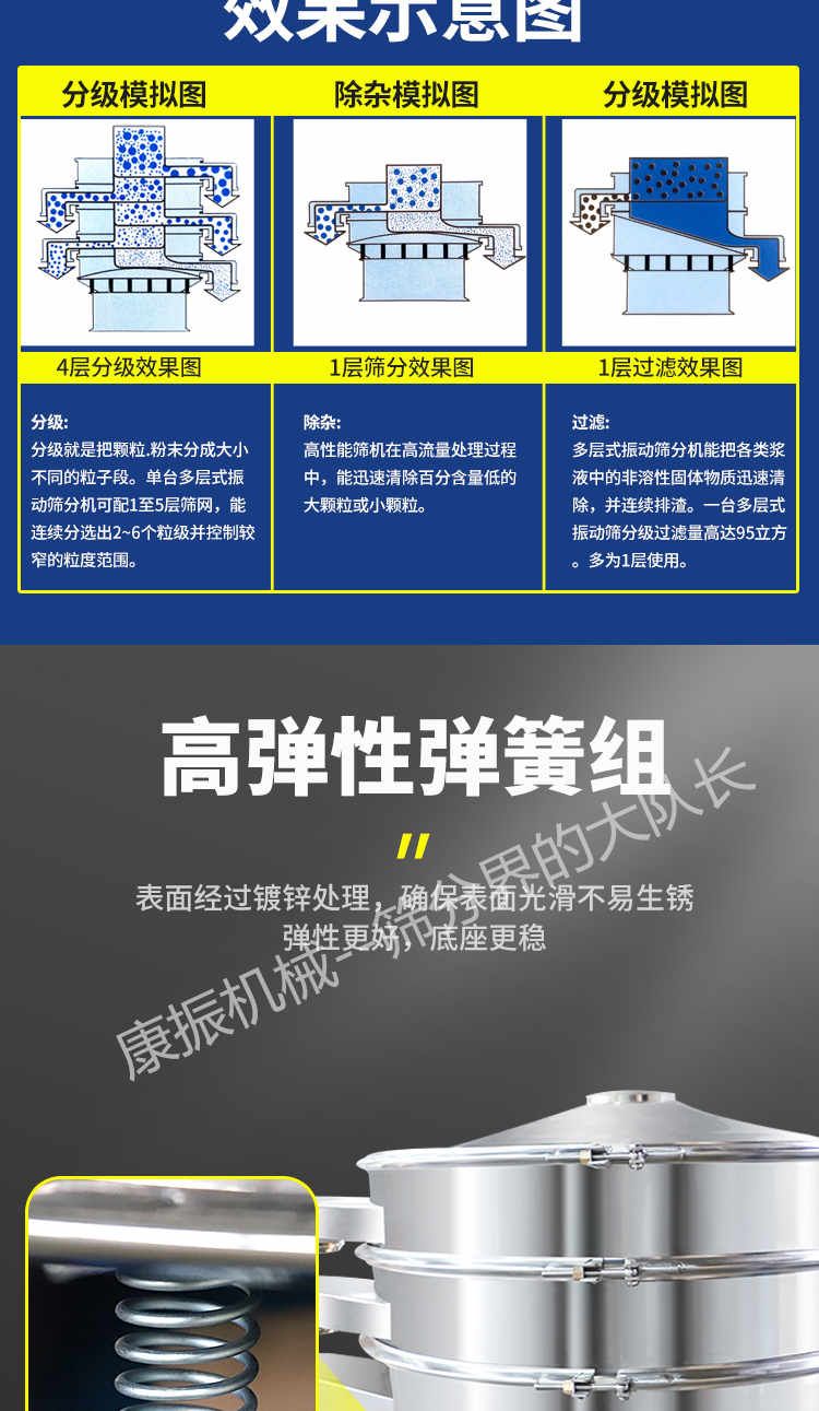 篩選范圍廣--只有系列三次元旋振篩能分選如此廣的原料范圍:任何顆粒、細粉、漿液都可以篩選。篩分細500目(28微米),過濾細5微米。網(wǎng)孔防堵塞--三次元振動功能及自動清理堵網(wǎng)裝置把堵網(wǎng)幾率降到小。 單層或多層分選--每臺旋振篩可選一至五層篩網(wǎng),能同時進行二到六個等級的分選或過濾。